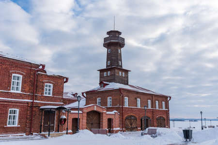 Kostroma, Russia - March 3, 2018. Kostroma Fire Tower on Susaninskaya Square. Sunny cold day on early russian spring.