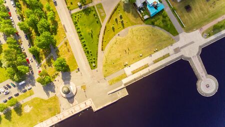 Top view of river embankment of city with forest. Clip. Landscaped embankment of city river bank. Beautiful landscape of river embankment with city park