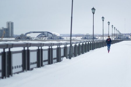 Young woman fitness model running at snow winter park, pink sneakers - wide angle