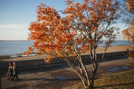 Autumn embankment with beautiful ash trees with orange leaves on a sunny day. Concept of good autumn weather