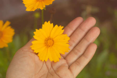 hand holding flower with beautiful color background. soft focus.