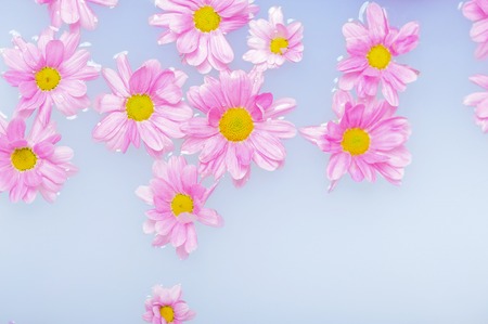 Blooming chamomile flowers on blue background