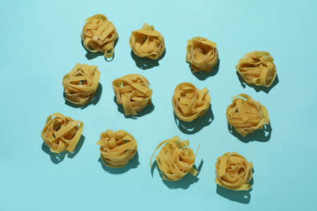 Nests of pasta on a blue background. Culinary background. Pyramid of noodles. Curled pasta on the table. Uncooked product. Cooking. Product made from flour and dough. Background from noodles.
