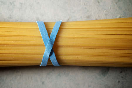 A vertical bunch of raw spaghetti tied with thread on a white plate. View from above. Italian food concept.