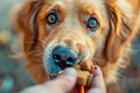 Owner holds a natural dog chew engaging the pet in a cheerful outdoor setting with a clear blue sky above while the dog eagerly anticipates its treat.