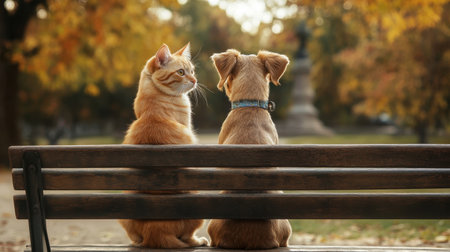 A charming scene of a ginger cat and a loyal dog sitting together on a bench, enjoying a peaceful moment in harmony surrounded by vibrant autumn colors.