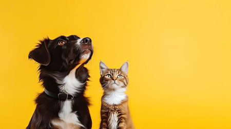Cute dog and cat together on a yellow background. Copy space.