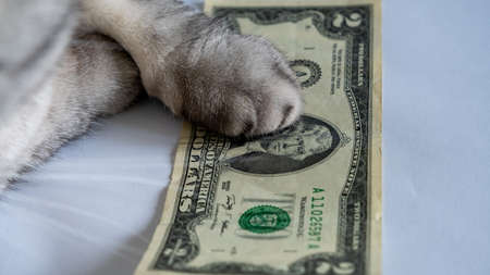 Cat's paws on the two dollar bill. Financial concept of business, corruption, home Finance.