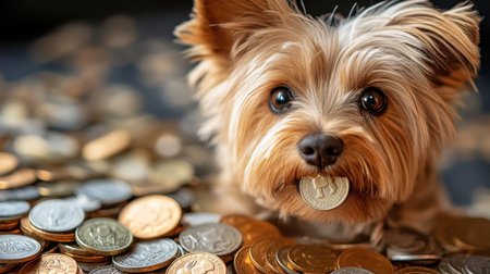 A charming dog playfully holds a coin in its mouth, surrounded by an array of shiny coins and currency. This scene captures the joy of pets and their playful nature.