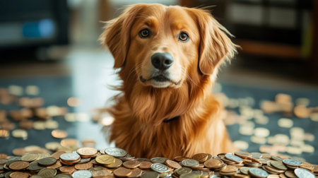 A charming golden retriever sits amidst scattered coins, exuding innocence and curiosity in a cozy home environment. Perfect for pet lovers.