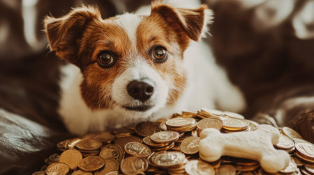 A charming dog sits among a pile of coins and a treat, symbolizing wealth and joy. Perfect for themes of finance, pets, and playful happiness.