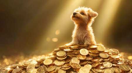 A charming dog sits playfully atop a mound of gold coins, basking in warm light. This image captures themes of happiness, wealth, and joy.