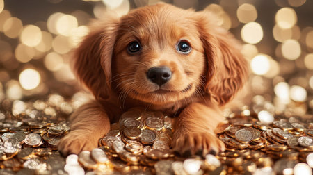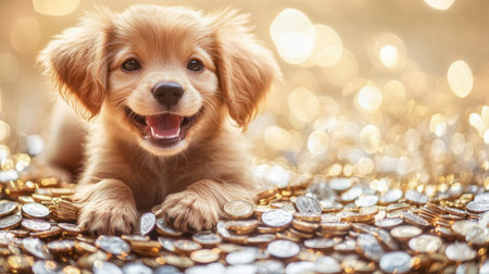 A joyful puppy rests on a bed of shimmering coins, radiating happiness. The playful expression and glimmering background create a charming and inviting atmosphere.