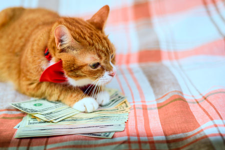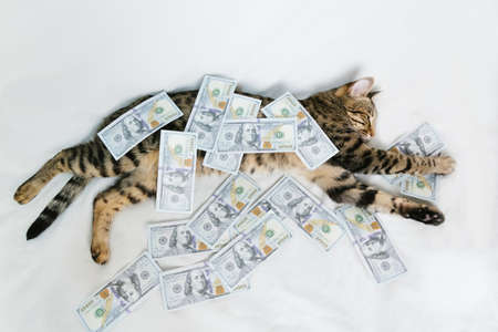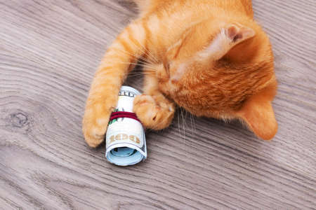 Homemade red cat lying on a pile of banknotes of American dollars.