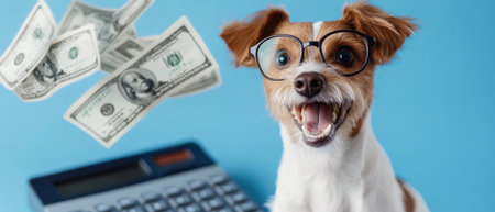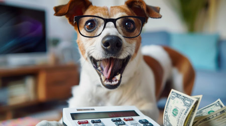 A dog wearing glasses and standing in front of a calculator with a pile of money in the air