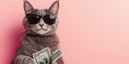 Cool Grey Cat Wearing Sunglasses Holds Cash Money on Pink Background, Success Concept
