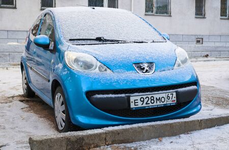 Smolensk, Russia - December 12, 2016: New city car Peugeot 107 parked in winter street after snowfall.