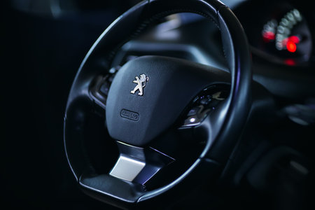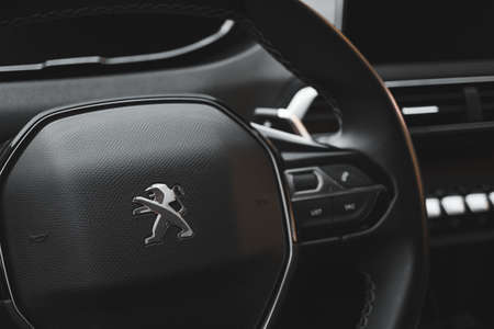 Rivne, Ukraine - 03.04, 2021: Close up peugeot logo on steering wheel with bokeh.
