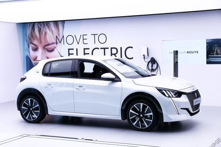 Geneva, Switzerland - March 10, 2019: All-electric motor car Peugeot e-208 Allure presented at the annual Geneva International Motor Show 2019.