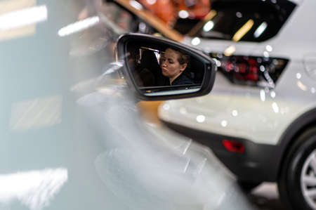 Riga, Latvia, Sep 24, 2021: women face in the car rearview mirror, selective focus, focus on the mirror