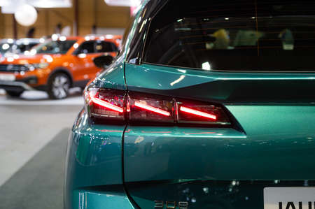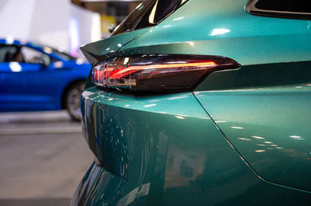 Kuala Lumpur, Malaysia – April 11, 2019 – Car and motocycle displayed at Moto Show in Kuala Lumpur. Exhibitors present most interesting aspects of the automotive industry. The image contains certain grain or noise and soft focus.
