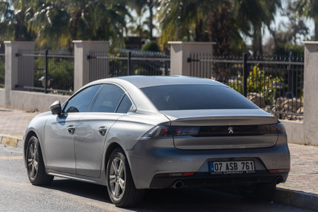 Side, Turkey – February 02 2022: silver Peugeot 508 is parked on the street on a warm summer day against the trees, fence