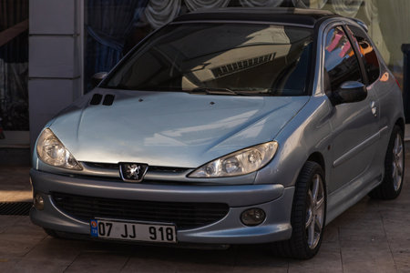 Side, Turkey -January 23, 2023: silver Peugeot 206 is parked on a warm summer day against the backdrop of a street