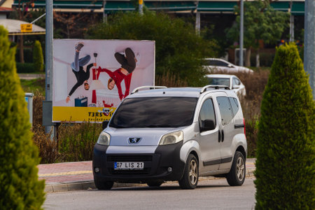 Side, Turkey -January 21, 2023: silver Peugeot Bipper is parked on the street on a warm summer day against the building, fence