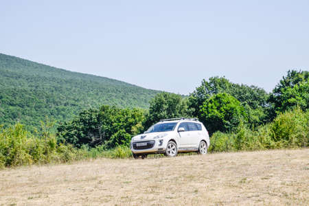 Forests next to the village of Shapsugskaya, Russia - July 30, 2016: White crossover Peugeot 4007 on the hill.