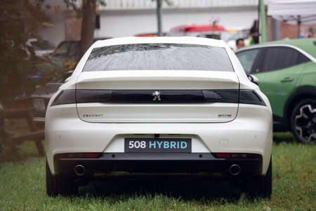 Cobreces, Spain - August 14, 2021: Exhibition of cars in Cobreces. The 508 model is a high-end saloon with a radical design from the French brand Peugeot. It has a plug-in Hybrid motor.