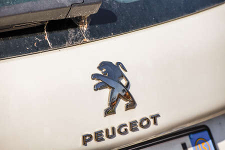 RAVENNA, ITALY - JUNE 9, 2018: Dirt and dust cover the PEUGEOT logo on a car body
