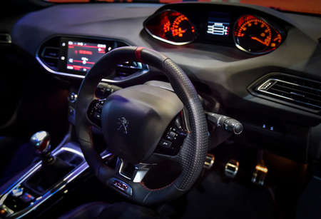 KUALA LUMPUR, MALAYSIA - DEC 3, 2019 : View of steering and interior new Peugeot 308 GTI displayed at Kuala Lumpur International Motor Show