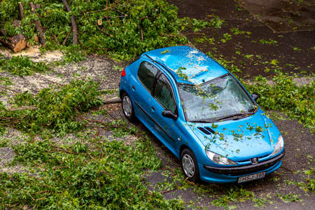 Looking at a damaged car caused by the fall of a large tree