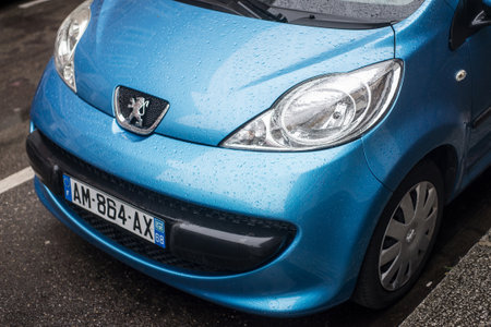 Mulhouse - France - 11 November 2018 - Closeup of rain drops on peugeot lion logo on black car front parked in the street