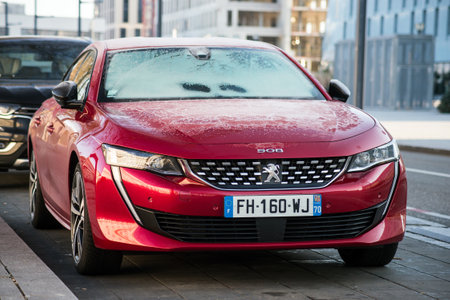 Mulhouse - France - 10 January 2021 - Front view of red Peugeot 508 covered by freeze parked in the street