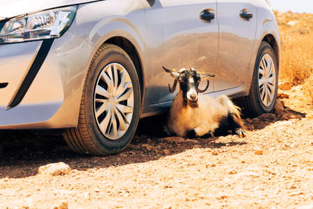 A goat lying in the shade of a car on a rocky road