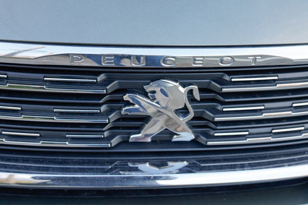 Barcelona, Spain - January 12, 2019: peugeot logo on the hood closeup.
