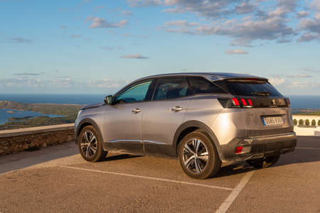Menorca, Spain - October 15, 2019: Peugeot 3008 SUV car parked on the top of El Toro Mountain on Menorca, Balearic Islands, Spain