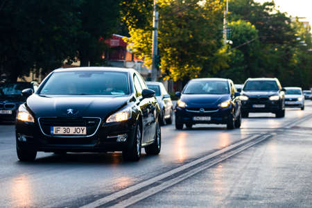 Car traffic at rush hour. Traffic jam, cars on the road at sunset in Bucharest, Romania, 2021