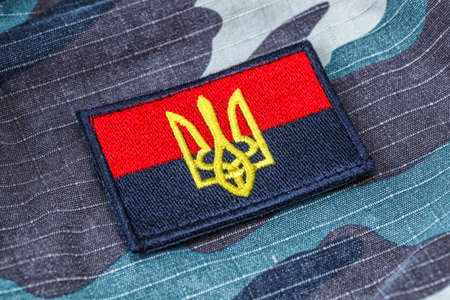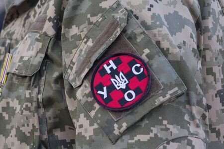 Kiev, Ukraine - October 14, 2018: Chevron of a radical political party. Ukrainian People’s Self-Defense, UNA-UNSO on the uniform of a fighter