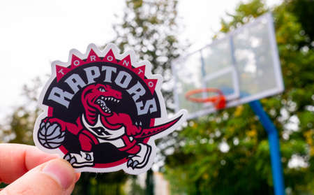 September 15, 2021, Toronto, Canada, A man holds the emblem of the Toronto Raptors basketball club in his hand on the sports field.