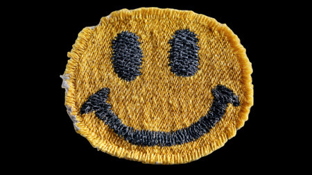 Yellow smiley face patch sewn onto cloth with transparent background
