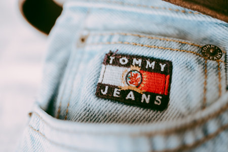 Closeup of Tommy Hilfiger label on blue jeans. Hilfiger Denim. Tommy Hilfiger blue jeans detail.