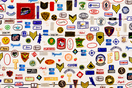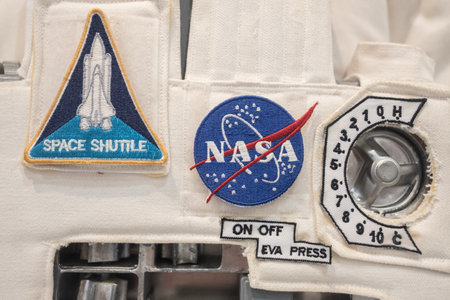 CHONBURI, THAILAND - SEPTEMBER 25, 2019: Closeup badges on space suite in Inspirium Museum, Si-Racha, Chonburi, Thailand.