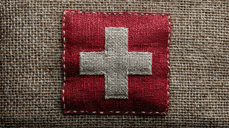 Close-up of a Swiss flag patch intricately stitched onto a textured burlap background, showcasing a unique blend of culture and artistry, ideal for travel themes.