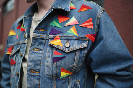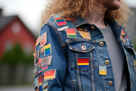 Close up of a young man wearing a denim jacket with a gay pride flag on it
