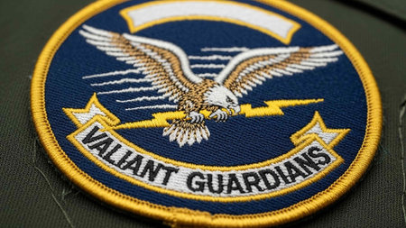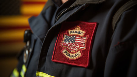 A detailed close-up of an American flag patch attached to a military uniform, showcasing the intricate embroidery and vibrant colors against a blurred warm background.