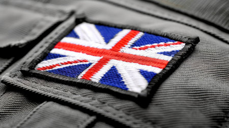A detailed focus on a British flag patch sewn onto dark gray military attire, evoking themes of commitment and sacrifice in a poignant setting.