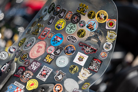 Stickers on motorbike windshield of past moto meets close up