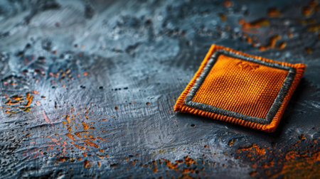 Orange fabric swatch with textured pattern on dark, gritty surface